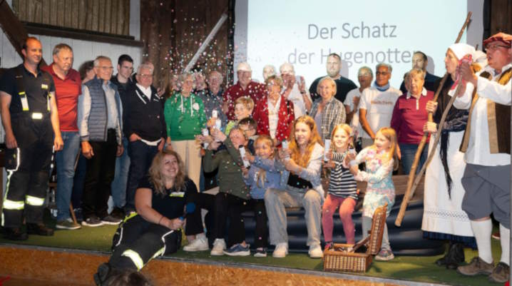Nach dem Kommers wurde das Theaterstück "Der Schatz der Hugenotten" von vielen Schönebergern aufgeführt. Umrahmt von der Musikschule Hofgeismar wurden fünf Ereignisse der letzten 25 Jahre dargestellt. Zweifellos der Höhepunkt des Abends, der vom Publikum gefeiert wurde.