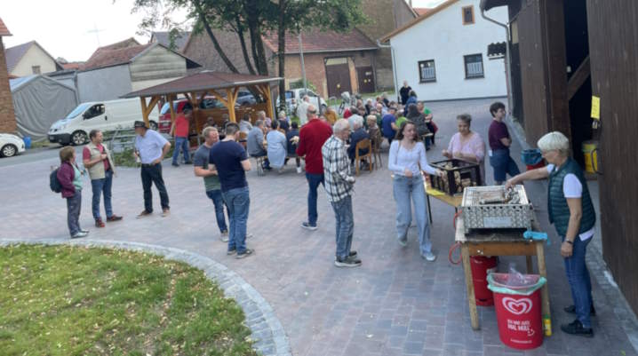 Direkt nach dem Dorfrundgang wurde der neue Willkommensplatz an der Schützenhalle eingeweiht. Zusammen mit dem neuen Dorftreff hat Schöneberg hier einen schönen neuen Veranstaltungsort. Das wurde bei kühlen Getränken und gegrillten Würstchen gefeiert.