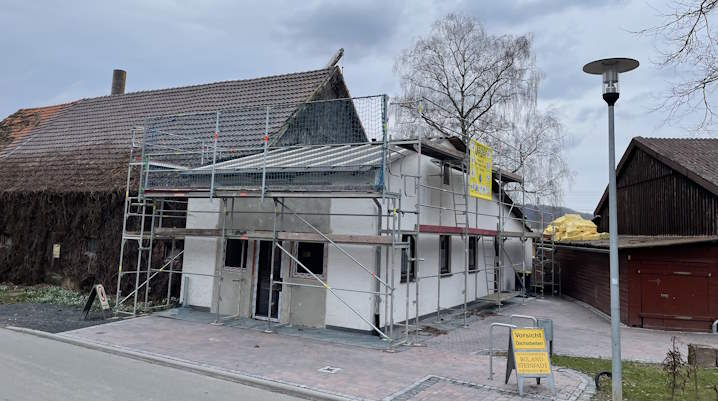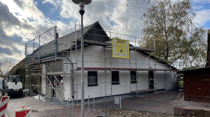 Der nächste Bauabschnitt hat begonnen: Das Gebäude wurde eingerüstet. Sobald die Wetterlage es zulässt, wird mit den Arbeiten am Dach begonnen. Das Dach wird komplett erneuert. Innen stehen immer noch Restarbeiten und Korrekturen an, die in den kommenden Tagen erledigt werden sollen.