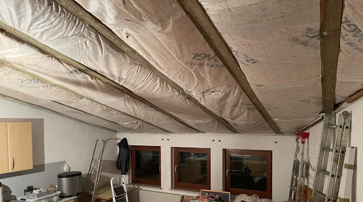 Endlich geht es draußen weiter: Heute hat der Dachdecker die ersten alten Dachplatten abgenommen und eine Dämmung und eine Sperrbahn angebracht. Die alte Dämmung über der Küche wurde entfernt und damit auch die Wohnung der nicht erwünschten tierischen Untermieter.