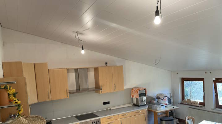 Heute wurde die neue Decke in der Küche fertiggestellt. Die alten Profilbretter wurden entfernt und eine neue Konterlattung angebracht. Anschließend wurden neue weiße Paneele montiert. Jetzt folgen noch neue Endleisten und die neue Beleuchtung. Vielen Dank an die Helfer und für die Verpflegung!
