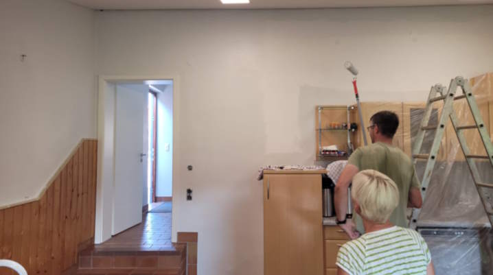 Heute wurde die Küche gestrichen. Nachdem die Wände an einigen Stellen neu verputzt und gespachtelt wurden, erhielten sie einen neuen Anstrich mit einer abwaschbaren Latexfarbe. Außerdem wurde nach langer Zeit die Schiebetür zu der barrierfreien Toilette eingebaut. Vielen Dank an die Helfer!