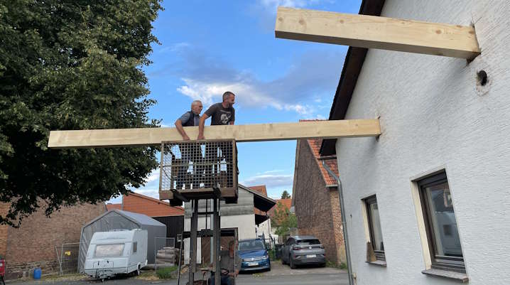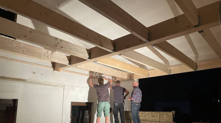 Heute wurde mit dem Einbau der Holzkonstruktion für die Zwischendecke begonnen. Nachdem die beiden Balken an den vorbereiteten Plätzen eingebaut wurden, startete die Montage der Zwischenbalken. Fortsetzung folgt. Vielen Dank an die Helfer und für die Brotzeit!