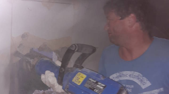 Nocheinmal eine staubige Angelegenheit: In den Giebel wurde eine Öffnung gestemmt, damit später der tote Raum über der Zwischendecke erreicht werden kann. Dafür wird eine kleine Holz-Tür oben in die Giebelwand eingebaut. Damit sollte der Rückbau beendet sein. Vielen Dank dafür!
