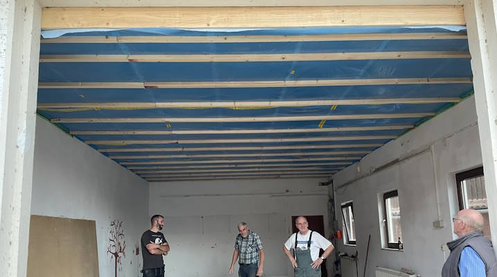 Heute wurde die Holzkonstruktion für die Zwischendecke fertiggestellt. Die restlichen Querbalken wurden eingezogen und die Auflagen an der Wand befestigt. Im nächsten Schritt wird die Dämmung eingelegt und befestigt. Vielen Dank an die Helfer und für die Brotzeit!
