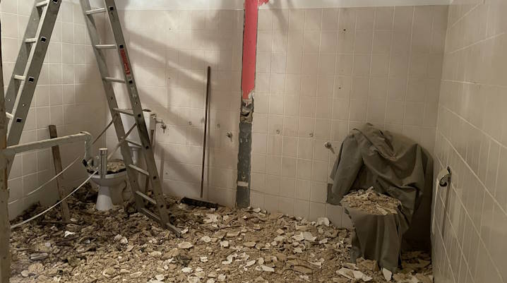 Heute wurden die Toiletten zurückgebaut. Die Sanitärobjekte, die Toilettenkabienen, teilweise die Zwischenwand und der Putz an der Decke wurden entfernt. Jetzt wird noch das Geflecht an der Decke entfernt, bevor dann neu aufgebaut wird. Dank an die Helfer und für die Verpflegung!