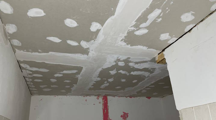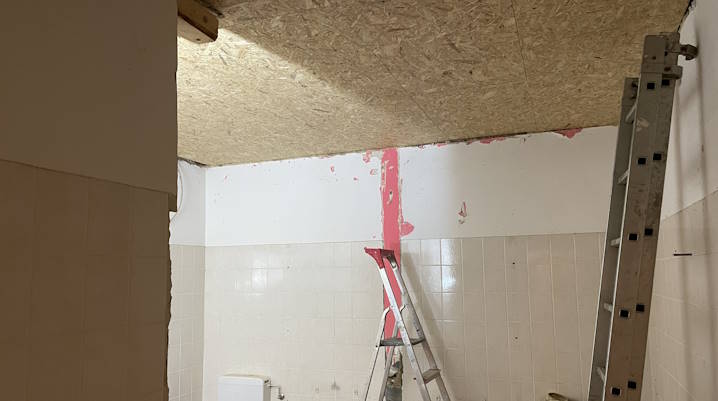 Nachdem die alte Decke mit Dämmung in den Toiletten rausgerissen wurde, begann am 14.09.2023 der neue Aufbau der Toiletten. Es wurde eine Holzdecke mit Dämmung eingebaut. Darunter werden dann Rigigps-Platten angebracht und anschließend die neuen Trennwände gebaut.