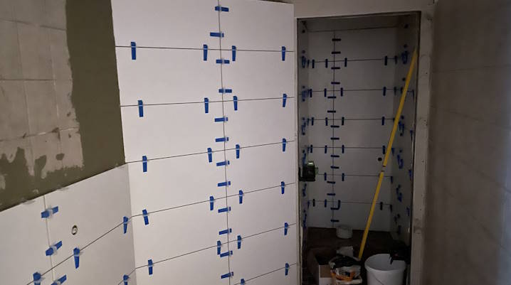 Heute wurden die ersten neuen Fliesen in den Toiletten geklebt. Die Räume werden bis zu einer Höhe von 2,10 Meter gefliest, darüber wird gestrichen. Sobald die Fliesenarbeiten abgeschlossen sind, werden neue Türen und Sanitärobjekte eingebaut. Dann folgen noch Maler- und Elektroarbeiten.