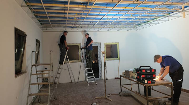 Heute wurde in den Toiletten eine neue Rigips-Decke eingebaut. Anschließend werden die neuen Trennwände erstellt und gefliest. Dann erfolgt der Einbau neuer Sanitär-Objekte, sowie Beleuchtung und Lüftung. Vielen Dank an die Helfer und für die Verpflegung!