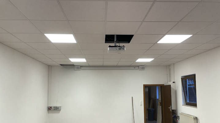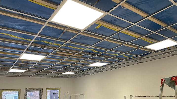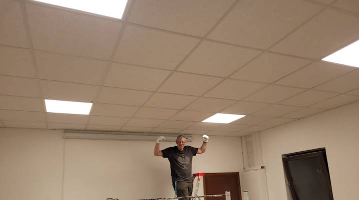 Nachdem die Rasterkonstruktion für die Odenwalddecke eingebaut wurde, konnte die Beleuchtung eingebaut werden. Dimmbare LED-Leuchten, Schalter und Steckdosen wurden montiert. Nach einer Grundreinigung sollen jetzt die Deckenplatten und der Beamer eingebaut wrden.