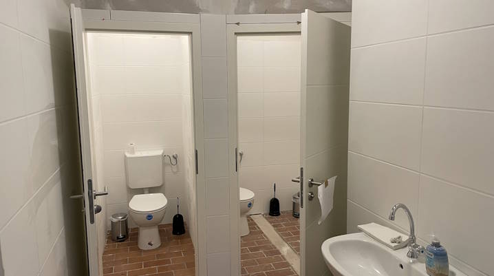Aktuell werden die Toiletten fertiggestellt. Nachdem die neuen Fliesen angebracht und die neuen Türen eingebaut wurden, wird noch ausgefugt und die Silikonfugen erstellt. Anschließend werden die Bodenfliesen noch ausgebessert. In den kommenden Tagen folgen noch weitere Restarbeiten.
