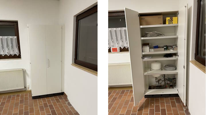 Die Heizung wurde mit einem Schrank umbaut und ist nun nicht mehr direkt sichtbar. Außerdem bietet der Schrank noch Stauraum für diverse Utensilien. Überschüssiges Baumaterial und die Reste wurden ausgeräumt und das Hugenottencafe vorbereitet.