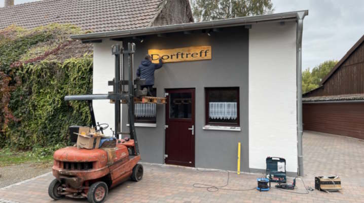 Am Dorftreff wurde heute ein Schild mit zwei Strahlern über dem Eingang montiert. Die Schrift wurde vorher mit Hilfe eines Beamers auf das Holzbrett gebracht. Jetzt ist der Dorftreff als solcher von außen gut zu erkennen. Wieder geht ein herzliches Dankeschön an die ehrenamtlichen Helfer!